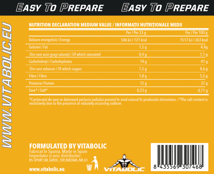 Vitabolic Protein Pancakes este o susa excelenta de proteine si carbohidrati fara adaos de zahar si sare. Cu acest produs, se prepara clatite hranitoare si delicioase ce vor fii foarte rapid si usor de facut. Vitabolic Pancakes sunt clatite nutritive pe baza de fulgi de ovăz si de proteine din zer, ouă si cazeină micelară.