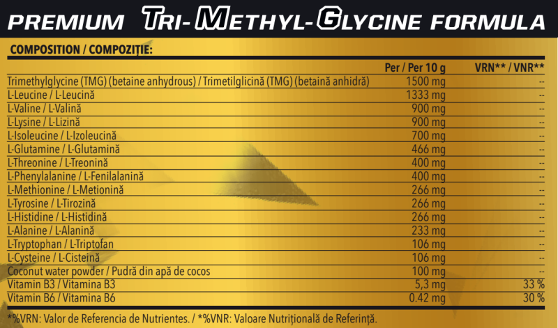 Ingrediente: Trimetilglicină (TMG) (betaină anhidră), L-leucină, L-valină, L-lizină HCl, L-isoleucină, acidifiant (acid citric), agent antiaglomerant (dioxid de siliciu), L-glutamină, L-treonină, L-fenilalanină, suc de lămâie pudră, L-tirozină, L-histidină, L-metionină, aromă, L-alanină, L-triptofan, L-cisteină, pudră din apă de cocos, îndulcitori (sucraloză, acesulfam și steviol glicozide), colorant (E-102) , nicotinamidă (vitamina B3) și clorhidrat de piridoxină (vitamina B6).
