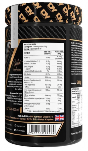 Ingrediente: L-Citrulină DL-Malat (2:1), Beta-alanină, Complex A-AKG (L-Arginină, Alfa-Cetoglutarat de Calciu), Agenți antiaglomeranți (Dioxid de siliciu, Săruri de calciu ale acidului ortofosforic), L-Tirozină (formă liberă de aminoacizi), Arome, Agent de încărcare (Maltodextrină), Cafeină anhidră, Extract din frunze de Ceai verde (Camellia Sinensis) (standardizat la 95% Polifenoli și 5% Cafeină), Îndulcitori (Sucraloză, Acesulfam-K), Extract 100% din coajă de Portocală dulce (Citrus Sinensis), Colorant (Caramel), Nicotinamidă (Vitamina B3), Extract din semințe de Guarana (Paullinia cupana) (standardizat la 22% Cafeină), Extract din fructe de Piper negru (Piper nigrum) (standardizat la 95% Piperină).