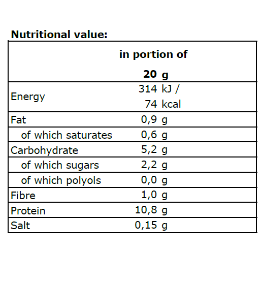Ingrediente: concentrat proteic din zer 60% (proteine din lapte, emulgator: lecitine de floarea soarelui), cafea instant (25%), lapte praf degresat, arome, sare, agent de ingrosare: guma xantan, indulcitor: sucraloza.