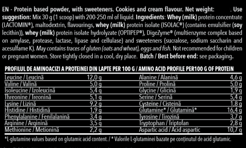 Ingrediente black cookies: Concentrat proteic din zer de lapte (LACTOMIN ®), maltodextrină, fursec de cacao măcinat OREO® (Făină de grâu (gluten), zahăr, ulei de palmier, ulei de rapiță, pudră de cacao 4,5 %, amidon de grâu (gluten), sirop de glucoză și fructoză, agent de afânare (carbonați de potasiu, carbonați de amoniu și carbonați de sodiu), sare, emulsifiant (lecitina de soia și lecitină de f loarea soarelui), aromă, arome, pudră de cacao (Theobroma cacao L.) , agent de îngroșare (guma xantan), izolat proteic din lapte (ISOLAC®) (conține emulgator (lecitină de soia)) , izolat proteic hidrolizat din lapte (OPTIPEP®) (conține emulgator (lecitină de soia)), iaurt (lapte) pudră, îndulcitori ((sucraloză și acesulfam K) și Digezyme (complex de multienzimatic pe bază de amilază, protează, lactază, lipază și celuloză).