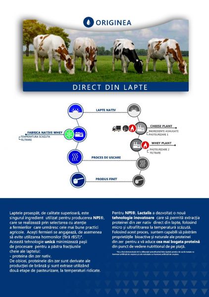 Un nou supliment de data asta din lapte, nu din zer, numit ironic "zer nativ", se obtine printr-un proces diferit de cel al pudrei de zer obisnuite pe care o stim. Proteina nativa (nativ conform dexului se poate traduce prin natural, pur, necombinat cu alte substante, forma cea mai aproape de natura) pur si simplu scapa de procesul de fabricare a branzei, cu mai multe etape, toate negative, despre care am discutat putin mai sus si ne-am convins cat de mult denatureaza si afecteaza produsul final. Proteina nativa se obtine direct din lapte ce este apoi filtrat. Ca tip de filtrare este folosita filtrarea printr-o membrana, lucru foarte comun in acest domeniu. Pentru cine conteaza, filtrarea are doua etape, ambele desfasurate la 15*C in laboratoarele Lactalis - microfiltrare si mai apoi ultrafiltrare - totul pentru a pastra intacta forma nativa a proteinei si mai ales, un nivel cat mai ridicat de microfractiuni peptidice benefice si al altor elemente pozitive din lapte. Rezultatul final este o proteina intacta si “mai” completa daca-mi scuzati expresia, nativa (mai aproape de forma proteinei originala), proteina care are un profil de aminoacizi usor diferit de cel al zerului obisnuit, conform unui studiu publicat in BMC Nutrition. Practic si mai pe scurt, pudrele de proteina obisnuite sunt obtinute din zer, concret, zerul este un produs secundar rezultat in urma procesarii laptelui de obicei la temperaturi ridicate ce inevitabil duce la denaturare si pierderi calitative, in timp ce Native Protein Isolate (proteina nativa) este direct obtinut din lapte si asta la temperaturi scazute si cu un nivel de denaturare practic inexistent. Alta chestie importanta in cazul proteinei native este faptul ca laptele acesta provine din Franta, de la procesatorul numarul 1 in lume de lapte Lactalis, si vine de la vacute fericite, crescute in aer liber si soare, ce se hranesc cu iarba, carora nu li se adminstreaza hormoni sau antibiotice. Despre cate produse putem spune asta? Zero hormoni, zero antibiotice, vacute hranite cu iarba si ce stau la soare, zero chimicale prin teste riguroase, nivel scazut de carbohidrati, nivel scazut de grasimi, nivel extrem de scazut de lactoza. Daca proteina nativa are toate aceste avantaje si caracteristici, proteina din zer obisnuita provine din urma procesarii laptelui si respectiv branzei, astfel contine reziduuri din branza, diferite chimicale in timp ce zerul este expus de mai multe ori la temperaturi ridicate care inevitabil reduc proprietatile naturale benefice si denatureaza proteina.
