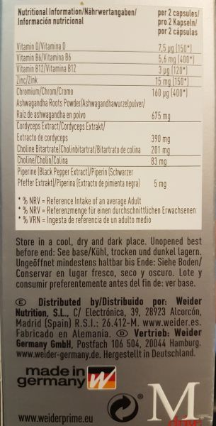 | Ashwagandha Roots Powder (contains milk), Cordyceps Extract, Gelatine, Choline Bitartrate, Anticaking Agents: E341, E551; Zinc Citrate, Chromium (III) Chloride, Vitamin B6, Bulking Agent: E470b, Vitamin B12, Piperine (Black Pepper Extract), Vitamin D3. |