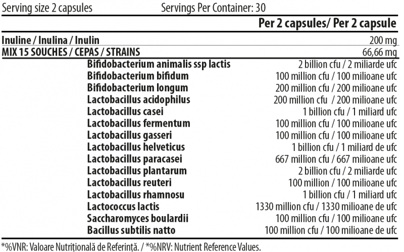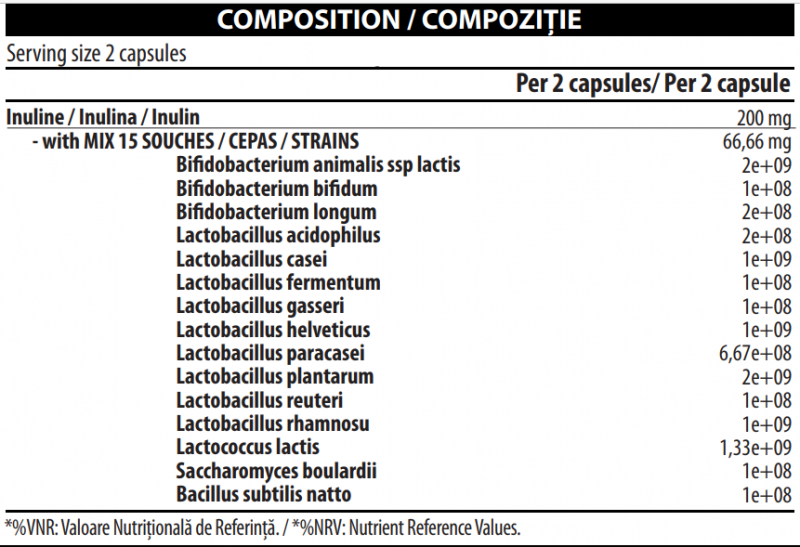 INGREDIENTE: Agent de încărcare (celuloză microcristalină), pulbere de inulină, agenți de glazurare (hidroxipropil metilceluloză și colorant (dioxid de titan)), MIX 15 CEPAS (amestec de fermentare), agenți antiaglomeranți (stearat de magneziu și dioxid de siliciu).